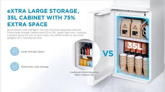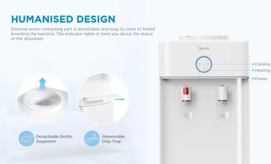 این دستگاه دو نازل خروجی آب گرم و سرد دارد. نازل آب سرد دارای دو حالت است و امکان خروج آب سرد و آب با دمای محیط از این نازل وجود دارد. گاز مبرد بهکاررفته در این دستگاه R134a است. این گاز دوستدار طبیعت است و برای لایهی ازن تهدیدی محسوب نمیشود. تامین آب این دستگاه از طریق منبع آب صورت میگیرد و منبع آب بهصورت وارونه بالای دستگاه قرار داده میشود. خروجی آب گرم و سرد این دستگاه بهترتیب 4 و 2 لیتر در ساعت است. زیر دستگاه یک کابین با گنجایش 20 لیتر قرار دارد